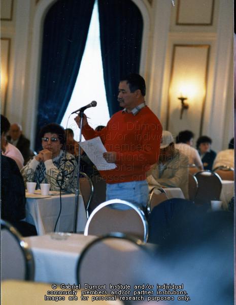 | Description: | This image is of Jim Parisien at a Métis Society of Saskatchewan conference in the winter of 1988-1989. |