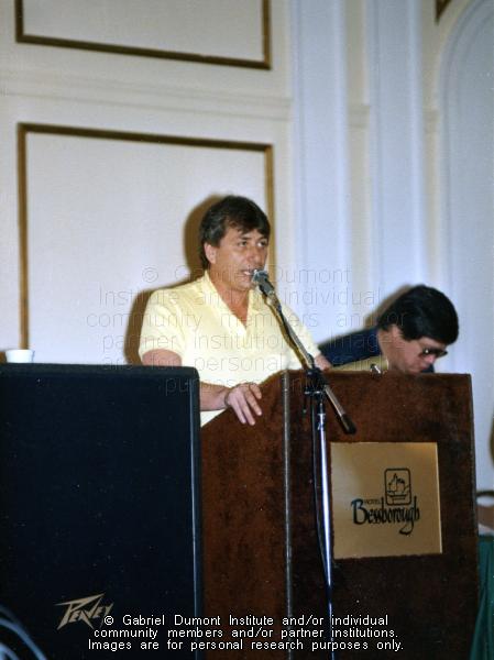 | Description: | This image is of Ed Pelletier at a Métis Society of Saskatchewan conference in the winter of 1988-1989. |