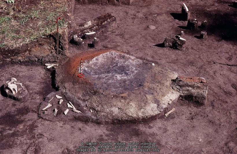 | Description: | This image is of the excavated Cabin B chimney mound x-section and fireplace base. This image is part of a collection of 45 images used in a slideshow presentation by Jack Elliott of the Kajewski Site, Cabins B and E.  Jack Elliott`s 1971 MA thesis—``Hivernant Archaeology in the Cypress Hills``—is based on an archaeological reconstruction of Cabins B and E of the Kajewski cabin site near Elkwater Alberta in the Cypress Hills. In this thesis, Jack Eliott analyzes the archaeological reconstruction of two Métis hivernant (``winterer``) cabins in the western half of the Cypress Hills. Hivernant is the French word for ``winterer,`` and in the Métis context refers to those Métis bison hunters and their families who settled during the winter in wooded, sheltered environments on the southern prairies such as the Cypress Hills, Wood Mountain, and Willow Bunch. These locales offered shelter from fierce prairie winters and provided game, wood, and fresh water. At the Kajewski site, Jack noticed that in the bison processing pits and in other areas of the cabin floors, there was a mixture of Euro-Canadian/American iron tools and older, Pre-Contact-style First Nation’s stone tools. At the time, archaeologists were puzzled by this mixture of tool cultures at the site and within its stratigraphy (the layer of sedimentation at an archaeological site), suggesting that the Métis at these wintering sites used the ``old`` and ``new`` tools interchangeably. Archaeologists thought it curious that the Métis hivernants willingly used stone tools when ``better`` iron tools were available to scrap bison hides and cut meat. Jack argued that the Métis used both tool types while his colleagues thought otherwise. This debate has continued to this day.