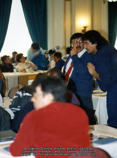 | Description: | This image is of Roy Fosseneuve (at the microphone) at a Métis Society of Saskatchewan conference in the winter of 1988-1989. |