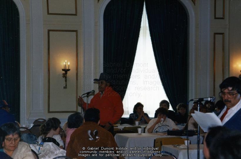 | Description: | This image is of Roy Fosseneuve (at the microphone, blue sweater) at a Métis Society of Saskatchewan conference in the winter of 1988-1989. The other man speaking at the other microphone is unknown. |