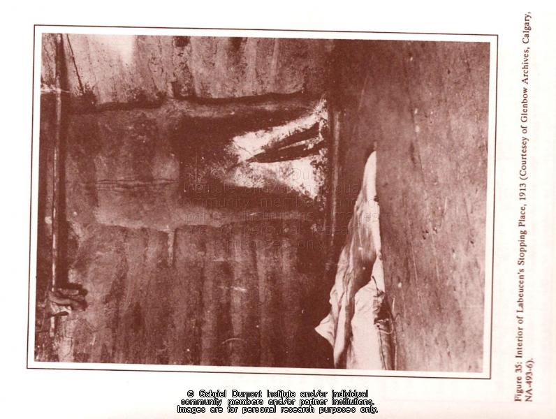 Description: This image is a Historic 1913 photograph of one of the log frame and clay chimneys common to Métis winter cabins. This image is part of a collection of 45 images used in a slideshow presentation by Jack Elliott of the Kajewski Site, Cabins B and E. Jack Elliott`s 1971 MA thesis—``Hivernant Archaeology in the Cypress Hills``—is based on an archaeological reconstruction of Cabins B and E of the Kajewski cabin site near Elkwater Alberta in the Cypress Hills. In this thesis, Jack Eliott analyzes the archaeological reconstruction of two Métis hivernant (``winterer``) cabins in the western half of the Cypress Hills. Hivernant is the French word for ``winterer,`` and in the Métis context refers to those Métis bison hunters and their families who settled during the winter in wooded, sheltered environments on the southern prairies such as the Cypress Hills, Wood Mountain, and Willow Bunch. These locales offered shelter from fierce prairie winters and provided game, wood, and fresh water. At the Kajewski site, Jack noticed that in the bison processing pits and in other areas of the cabin floors, there was a mixture of Euro-Canadian/American iron tools and older, Pre-Contact-style First Nation’s stone tools. At the time, archaeologists were puzzled by this mixture of tool cultures at the site and within its stratigraphy (the layer of sedimentation at an archaeological site), suggesting that the Métis at these wintering sites used the ``old`` and ``new`` tools interchangeably. Archaeologists thought it curious that the Métis hivernants willingly used stone tools when ``better`` iron tools were available to scrap bison hides and cut meat. Jack argued that the Métis used both tool types while his colleagues thought otherwise. This debate has continued to this day.