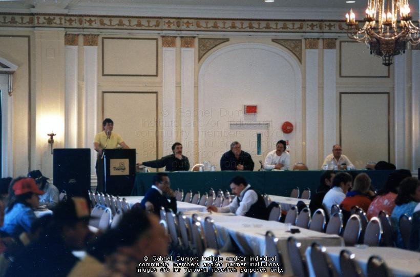 This image is of (left to right) Ed Pelletier (at the microphone), Murray Hamilton, Clifford LaRocque, Ashley Norton, and Harold Lajimodiere at a Métis Society of Saskatchewan conference in the winter of 1988-1989. |
