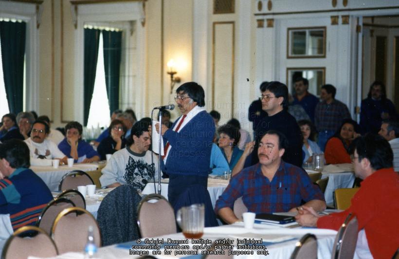 | Description: | This image is of Roy Fosseneuve (at the microphone) at a Métis Society of Saskatchewan conference in the winter of 1988-1989. |