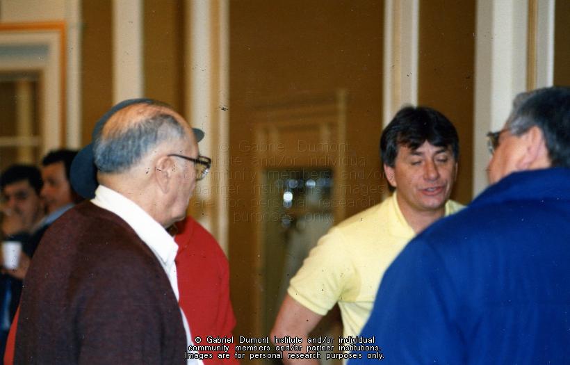 This image is of (left to right) Harold Lajimodiere, Edwin Pelletier (red shirt), Ed Pelletier, and Clifford LaRocque (blue coat) at a Métis Society of Saskatchewan conference in the winter of 1988-1989. |