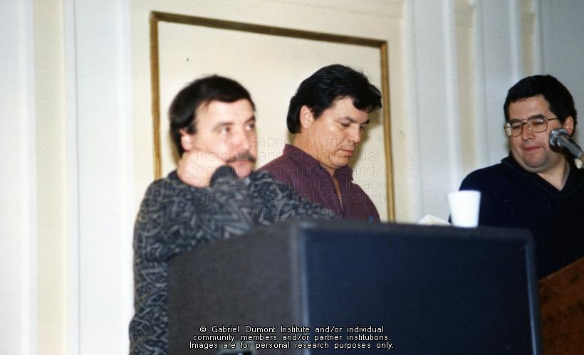 This image is of (left to right) Murray Hamilton, Philip Chartier, and Christopher Lafontaine at a Métis Society of Saskatchewan conference in the winter of 1988-1989. |