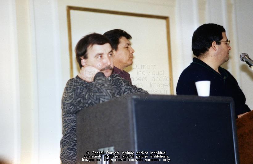 This image is of (left to right) Murray Hamilton, Philip Chartier, and Christopher Lafontaine at a Métis Society of Saskatchewan conference in the winter of 1988-1989. |
