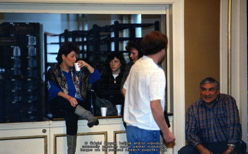 This image is of (left to right) an unknown woman (drinking coffee), an unknown girl, Donna Desmarais, Merril Fiddler (white shirt), and Claude Petit at a Métis Society of Saskatchewan conference in the winter of 1988-1989. |