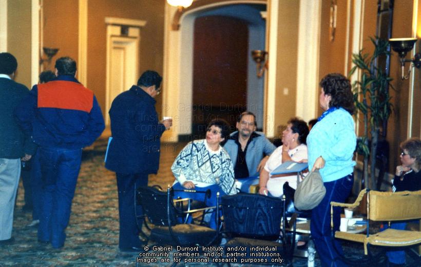 | Description: | This image is of (left to right) Nora Ritchie (Cummings) and Victoria (Racette) Polsfut at a Métis Society of Saskatchewan conference in the winter of 1988-1989. Both women are sitting down. |