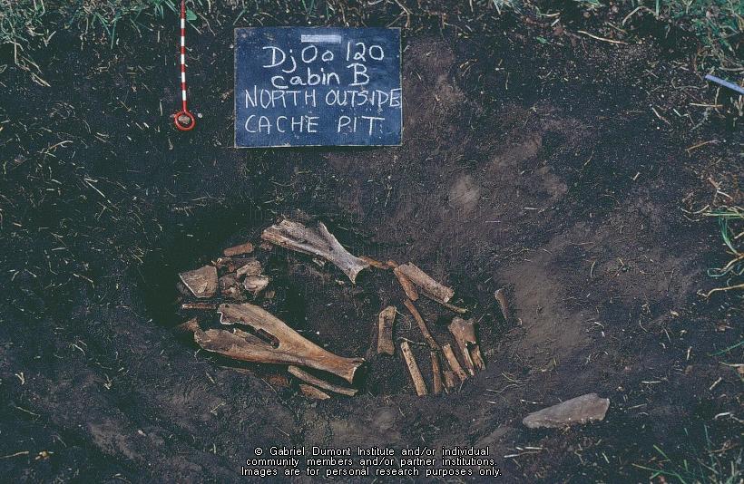 Description: This image is of a cache pit outside Cabin B. Note whetstone for sharpening steel tools at pit edge. This image is part of a collection of 45 images used in a slideshow presentation by Jack Elliott of the Kajewski Site, Cabins B and E. Jack Elliott`s 1971 MA thesis—``Hivernant Archaeology in the Cypress Hills``—is based on an archaeological reconstruction of Cabins B and E of the Kajewski cabin site near Elkwater Alberta in the Cypress Hills. In this thesis, Jack Eliott analyzes the archaeological reconstruction of two Métis hivernant (``winterer``) cabins in the western half of the Cypress Hills. Hivernant is the French word for ``winterer,`` and in the Métis context refers to those Métis bison hunters and their families who settled during the winter in wooded, sheltered environments on the southern prairies such as the Cypress Hills, Wood Mountain, and Willow Bunch. These locales offered shelter from fierce prairie winters and provided game, wood, and fresh water. At the Kajewski site, Jack noticed that in the bison processing pits and in other areas of the cabin floors, there was a mixture of Euro-Canadian/American iron tools and older, Pre-Contact-style First Nation’s stone tools. At the time, archaeologists were puzzled by this mixture of tool cultures at the site and within its stratigraphy (the layer of sedimentation at an archaeological site), suggesting that the Métis at these wintering sites used the ``old`` and ``new`` tools interchangeably. Archaeologists thought it curious that the Métis hivernants willingly used stone tools when ``better`` iron tools were available to scrap bison hides and cut meat. Jack argued that the Métis used both tool types while his colleagues thought otherwise. This debate has continued to this day.