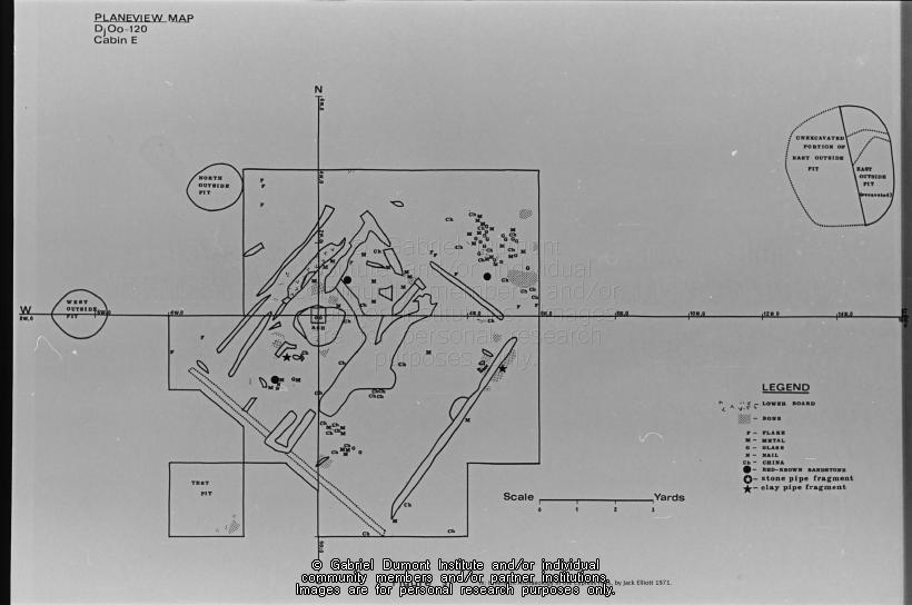 Description: This image is plan view map of Cabin E. This image is part of a collection of 45 images used in a slideshow presentation by Jack Elliott of the Kajewski Site, Cabins B and E. Jack Elliott`s 1971 MA thesis—``Hivernant Archaeology in the Cypress Hills``—is based on an archaeological reconstruction of Cabins B and E of the Kajewski cabin site near Elkwater Alberta in the Cypress Hills. In this thesis, Jack Eliott analyzes the archaeological reconstruction of two Métis hivernant (``winterer``) cabins in the western half of the Cypress Hills. Hivernant is the French word for ``winterer,`` and in the Métis context refers to those Métis bison hunters and their families who settled during the winter in wooded, sheltered environments on the southern prairies such as the Cypress Hills, Wood Mountain, and Willow Bunch. These locales offered shelter from fierce prairie winters and provided game, wood, and fresh water. At the Kajewski site, Jack noticed that in the bison processing pits and in other areas of the cabin floors, there was a mixture of Euro-Canadian/American iron tools and older, Pre-Contact-style First Nation’s stone tools. At the time, archaeologists were puzzled by this mixture of tool cultures at the site and within its stratigraphy (the layer of sedimentation at an archaeological site), suggesting that the Métis at these wintering sites used the ``old`` and ``new`` tools interchangeably. Archaeologists thought it curious that the Métis hivernants willingly used stone tools when ``better`` iron tools were available to scrap bison hides and cut meat. Jack argued that the Métis used both tool types while his colleagues thought otherwise. This debate has continued to this day.