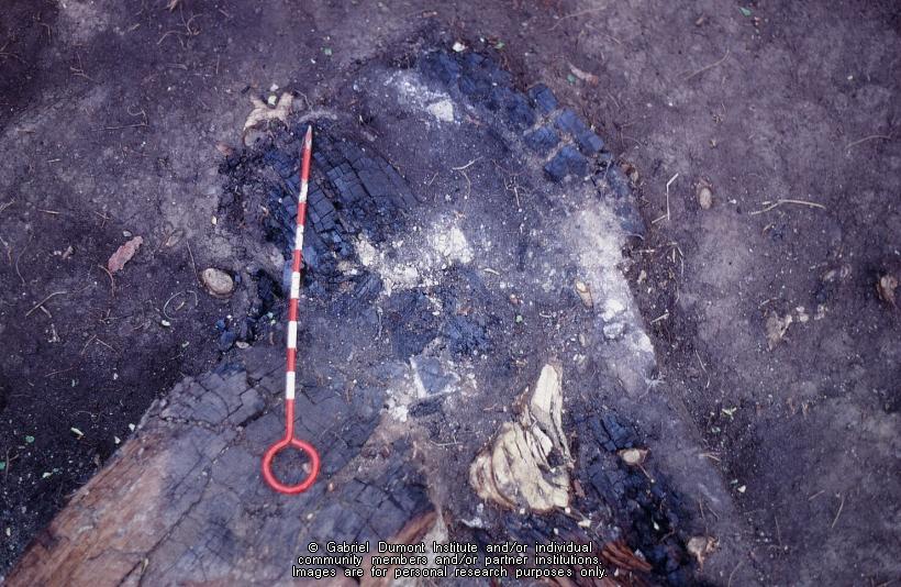 | Description: | This image is of the possible Red River-style corner construction detail in Cabin E (badly burned). This image is part of a collection of 45 images used in a slideshow presentation by Jack Elliott of the Kajewski Site, Cabins B and E.  Jack Elliott`s 1971 MA thesis—``Hivernant Archaeology in the Cypress Hills``—is based on an archaeological reconstruction of Cabins B and E of the Kajewski cabin site near Elkwater Alberta in the Cypress Hills. In this thesis, Jack Eliott analyzes the archaeological reconstruction of two Métis hivernant (``winterer``) cabins in the western half of the Cypress Hills. Hivernant is the French word for ``winterer,`` and in the Métis context refers to those Métis bison hunters and their families who settled during the winter in wooded, sheltered environments on the southern prairies such as the Cypress Hills, Wood Mountain, and Willow Bunch. These locales offered shelter from fierce prairie winters and provided game, wood, and fresh water. At the Kajewski site, Jack noticed that in the bison processing pits and in other areas of the cabin floors, there was a mixture of Euro-Canadian/American iron tools and older, Pre-Contact-style First Nation’s stone tools. At the time, archaeologists were puzzled by this mixture of tool cultures at the site and within its stratigraphy (the layer of sedimentation at an archaeological site), suggesting that the Métis at these wintering sites used the ``old`` and ``new`` tools interchangeably. Archaeologists thought it curious that the Métis hivernants willingly used stone tools when ``better`` iron tools were available to scrap bison hides and cut meat. Jack argued that the Métis used both tool types while his colleagues thought otherwise. This debate has continued to this day.
