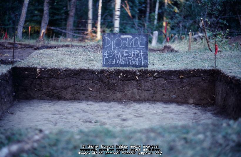 | Description: | This is an image of a stratigraphic test pit excavated to verify vertical relationships of artifacts deposited in the ground. This image is part of a collection of 45 images used in a slideshow presentation by Jack Elliott of the Kajewski Site, Cabins B and E.  Jack Elliott`s 1971 MA thesis—``Hivernant Archaeology in the Cypress Hills``—is based on an archaeological reconstruction of Cabins B and E of the Kajewski cabin site near Elkwater Alberta in the Cypress Hills. In this thesis, Jack Eliott analyzes the archaeological reconstruction of two Métis hivernant (``winterer``) cabins in the western half of the Cypress Hills. Hivernant is the French word for ``winterer,`` and in the Métis context refers to those Métis bison hunters and their families who settled during the winter in wooded, sheltered environments on the southern prairies such as the Cypress Hills, Wood Mountain, and Willow Bunch. These locales offered shelter from fierce prairie winters and provided game, wood, and fresh water. At the Kajewski site, Jack noticed that in the bison processing pits and in other areas of the cabin floors, there was a mixture of Euro-Canadian/American iron tools and older, Pre-Contact-style First Nation’s stone tools. At the time, archaeologists were puzzled by this mixture of tool cultures at the site and within its stratigraphy (the layer of sedimentation at an archaeological site), suggesting that the Métis at these wintering sites used the ``old`` and ``new`` tools interchangeably. Archaeologists thought it curious that the Métis hivernants willingly used stone tools when ``better`` iron tools were available to scrap bison hides and cut meat. Jack argued that the Métis used both tool types while his colleagues thought otherwise. This debate has continued to this day.