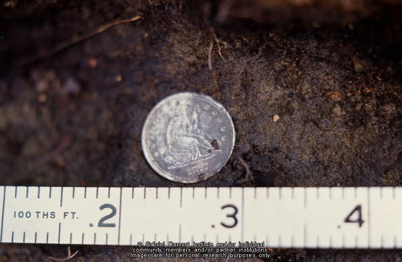 | Description: | This image is a close-up view of the 1877 quarter dollar coin. This image is part of a collection of 45 images used in a slideshow presentation by Jack Elliott of the Kajewski Site, Cabins B and E.  Jack Elliott`s 1971 MA thesis—``Hivernant Archaeology in the Cypress Hills``—is based on an archaeological reconstruction of Cabins B and E of the Kajewski cabin site near Elkwater Alberta in the Cypress Hills. In this thesis, Jack Eliott analyzes the archaeological reconstruction of two Métis hivernant (``winterer``) cabins in the western half of the Cypress Hills. Hivernant is the French word for ``winterer,`` and in the Métis context refers to those Métis bison hunters and their families who settled during the winter in wooded, sheltered environments on the southern prairies such as the Cypress Hills, Wood Mountain, and Willow Bunch. These locales offered shelter from fierce prairie winters and provided game, wood, and fresh water. At the Kajewski site, Jack noticed that in the bison processing pits and in other areas of the cabin floors, there was a mixture of Euro-Canadian/American iron tools and older, Pre-Contact-style First Nation’s stone tools. At the time, archaeologists were puzzled by this mixture of tool cultures at the site and within its stratigraphy (the layer of sedimentation at an archaeological site), suggesting that the Métis at these wintering sites used the ``old`` and ``new`` tools interchangeably. Archaeologists thought it curious that the Métis hivernants willingly used stone tools when ``better`` iron tools were available to scrap bison hides and cut meat. Jack argued that the Métis used both tool types while his colleagues thought otherwise. This debate has continued to this day.