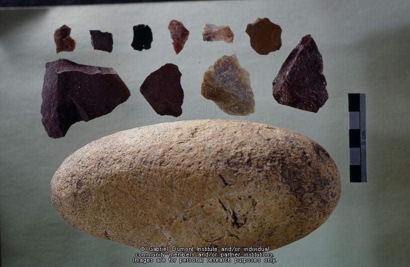 Description: This image is of a quartzite hammerstone & waste flakes, from making and resharpening stone tools. This image is part of a collection of 45 images used in a slideshow presentation by Jack Elliott of the Kajewski Site, Cabins B and E. Jack Elliott`s 1971 MA thesis—``Hivernant Archaeology in the Cypress Hills``—is based on an archaeological reconstruction of Cabins B and E of the Kajewski cabin site near Elkwater Alberta in the Cypress Hills. In this thesis, Jack Eliott analyzes the archaeological reconstruction of two Métis hivernant (``winterer``) cabins in the western half of the Cypress Hills. Hivernant is the French word for ``winterer,`` and in the Métis context refers to those Métis bison hunters and their families who settled during the winter in wooded, sheltered environments on the southern prairies such as the Cypress Hills, Wood Mountain, and Willow Bunch. These locales offered shelter from fierce prairie winters and provided game, wood, and fresh water. At the Kajewski site, Jack noticed that in the bison processing pits and in other areas of the cabin floors, there was a mixture of Euro-Canadian/American iron tools and older, Pre-Contact-style First Nation’s stone tools. At the time, archaeologists were puzzled by this mixture of tool cultures at the site and within its stratigraphy (the layer of sedimentation at an archaeological site), suggesting that the Métis at these wintering sites used the ``old`` and ``new`` tools interchangeably. Archaeologists thought it curious that the Métis hivernants willingly used stone tools when ``better`` iron tools were available to scrap bison hides and cut meat. Jack argued that the Métis used both tool types while his colleagues thought otherwise. This debate has continued to this day.