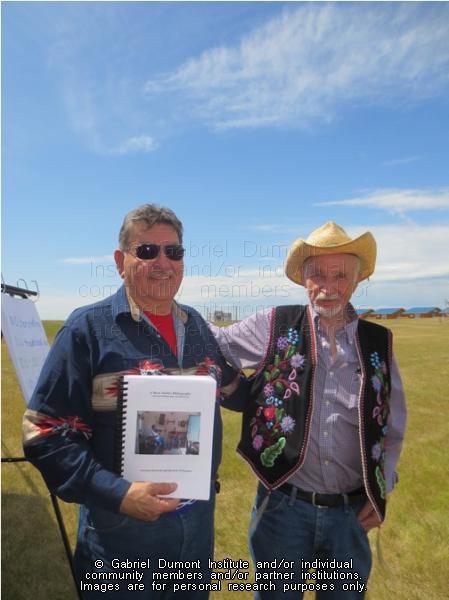 | Description: | This is an image of Norman Fleury and Lawrence Barkwell at the Louis Riel Institute's Michif workshop at Back to Batoche, 2015. |