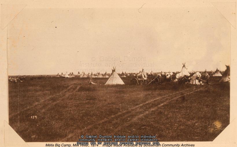 | Description: | This image is of the same Métis brigade “big camp” near Milk River in 1874. This image is part of a slide show presentation by Jack Elliott relating to Métis hivernant bison hunters and hide workers in the Cypress Hills. The 24 images in this collection scans of published Paul Kane paintings and sketches (#7-11, 14-15), photos from Boissevain Community Archives (#3-5), artifact photos from the Kajewski Site (as described above #12-13, 20, 22-24) and various other scans and images — as referenced or described in the slide show talk notes, and 4 copies of informant permissions for published use of interviews.  Jack Elliott`s 1971 MA thesis—``Hivernant Archaeology in the Cypress Hills``—is based on an archaeological reconstruction of Cabins B and E of the Kajewski cabin site near Elkwater Alberta in the Cypress Hills. In this thesis, Jack Eliott analyzes the archaeological reconstruction of two Métis hivernant (``winterer``) cabins in the western half of the Cypress Hills. Hivernant is the French word for ``winterer,`` and in the Métis context refers to those Métis bison hunters and their families who settled during the winter in wooded, sheltered environments on the southern prairies such as the Cypress Hills, Wood Mountain, and Willow Bunch. These locales offered shelter from fierce prairie winters and provided game, wood, and fresh water. At the Kajewski site, Jack noticed that in the bison processing pits and in other areas of the cabin floors, there was a mixture of Euro-Canadian/American iron tools and older, Pre-Contact-style First Nation’s stone tools. At the time, archaeologists were puzzled by this mixture of tool cultures at the site and within its stratigraphy (the layer of sedimentation at an archaeological site), suggesting that the Métis at these wintering sites used the ``old`` and ``new`` tools interchangeably. Archaeologists thought it curious that the Métis hivernants willingly used stone tools when ``better`` iron tools were available to scrap bison hides and cut meat. Jack argued that the Métis used both tool types while his colleagues thought otherwise. This debate has continued to this day.