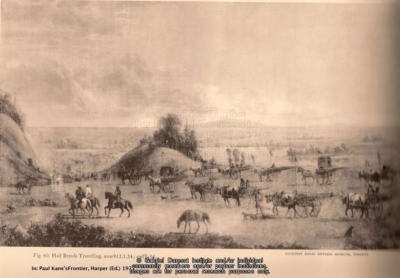 | Description: | This image is of a brigade out hunting, Paul Kane sketches of Red River cart & harnessed ox as primary brigade vehicle, putting up camp, camp scene, brigade leaders meeting before a hunt. This image is part of a slide show presentation by Jack Elliott relating to Métis hivernant bison hunters and hide workers in the Cypress Hills. The 24 images in this collection scans of published Paul Kane paintings and sketches (#7-11, 14-15), photos from Boissevain Community Archives (#3-5), artifact photos from the Kajewski Site (as described above #12-13, 20, 22-24) and various other scans and images — as referenced or described in the slide show talk notes, and 4 copies of informant permissions for published use of interviews.  Jack Elliott`s 1971 MA thesis—``Hivernant Archaeology in the Cypress Hills``—is based on an archaeological reconstruction of Cabins B and E of the Kajewski cabin site near Elkwater Alberta in the Cypress Hills. In this thesis, Jack Eliott analyzes the archaeological reconstruction of two Métis hivernant (``winterer``) cabins in the western half of the Cypress Hills. Hivernant is the French word for ``winterer,`` and in the Métis context refers to those Métis bison hunters and their families who settled during the winter in wooded, sheltered environments on the southern prairies such as the Cypress Hills, Wood Mountain, and Willow Bunch. These locales offered shelter from fierce prairie winters and provided game, wood, and fresh water. At the Kajewski site, Jack noticed that in the bison processing pits and in other areas of the cabin floors, there was a mixture of Euro-Canadian/American iron tools and older, Pre-Contact-style First Nation’s stone tools. At the time, archaeologists were puzzled by this mixture of tool cultures at the site and within its stratigraphy (the layer of sedimentation at an archaeological site), suggesting that the Métis at these wintering sites used the ``old`` and ``new`` tools interchangeably. Archaeologists thought it curious that the Métis hivernants willingly used stone tools when ``better`` iron tools were available to scrap bison hides and cut meat. Jack argued that the Métis used both tool types while his colleagues thought otherwise. This debate has continued to this day.