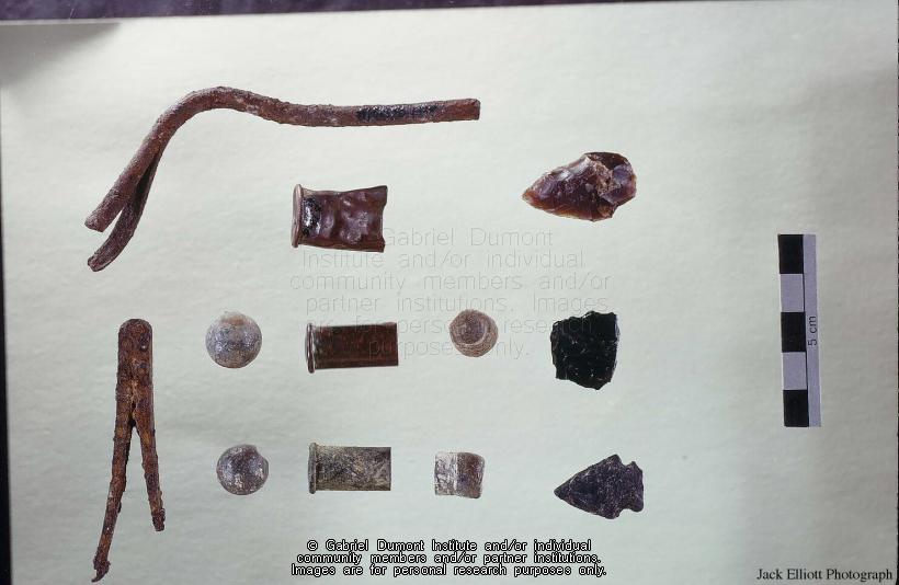| Description: | this image of hunting and defence items from Head-of-the-Mountain cabins, Cypress Hills. This image is part of a slide show presentation by Jack Elliott relating to Métis hivernant bison hunters and hide workers in the Cypress Hills. The 24 images in this collection scans of published Paul Kane paintings and sketches (#7-11, 14-15), photos from Boissevain Community Archives (#3-5), artifact photos from the Kajewski Site (as described above #12-13, 20, 22-24) and various other scans and images — as referenced or described in the slide show talk notes, and 4 copies of informant permissions for published use of interviews.  Jack Elliott`s 1971 MA thesis—``Hivernant Archaeology in the Cypress Hills``—is based on an archaeological reconstruction of Cabins B and E of the Kajewski cabin site near Elkwater Alberta in the Cypress Hills. In this thesis, Jack Eliott analyzes the archaeological reconstruction of two Métis hivernant (``winterer``) cabins in the western half of the Cypress Hills. Hivernant is the French word for ``winterer,`` and in the Métis context refers to those Métis bison hunters and their families who settled during the winter in wooded, sheltered environments on the southern prairies such as the Cypress Hills, Wood Mountain, and Willow Bunch. These locales offered shelter from fierce prairie winters and provided game, wood, and fresh water. At the Kajewski site, Jack noticed that in the bison processing pits and in other areas of the cabin floors, there was a mixture of Euro-Canadian/American iron tools and older, Pre-Contact-style First Nation’s stone tools. At the time, archaeologists were puzzled by this mixture of tool cultures at the site and within its stratigraphy (the layer of sedimentation at an archaeological site), suggesting that the Métis at these wintering sites used the ``old`` and ``new`` tools interchangeably. Archaeologists thought it curious that the Métis hivernants willingly used stone tools when ``better`` iron tools were available to scrap bison hides and cut meat. Jack argued that the Métis used both tool types while his colleagues thought otherwise. This debate has continued to this day.