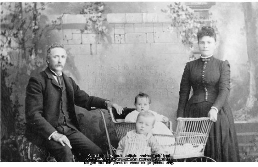| Description: | This is an image of Paul Morase and his wife Margaret Daniel and their children, Peter (b. 1876 at what is now Hinsdale, Montana) and Selena (b. 1879 at what is now Hinsdale, Montana). This photograph was likely taken in what is now Lewiston, Montana. At the time, Margaret was pregnant with Thomas who was born in June 1882 at Lewiston, Montana. Margaret’s surname was anglicized from the original Daignon. Photograph and information submitted by Chris Garbers, the great-great grandson of Daniel and Margaret. He is descended from Mary Albina Morase (b. March 1886 at Lewiston, Montana), the fifth child of Daniel and Margaret. |
