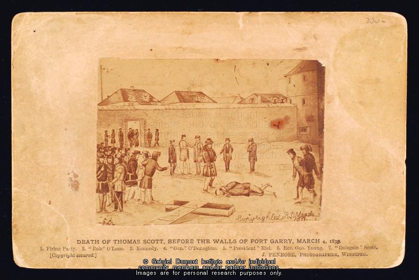 | Description: | This image, part of the Gabriel Dumont Institute collection, is a tobacco card of Thomas Scott`s execution. |