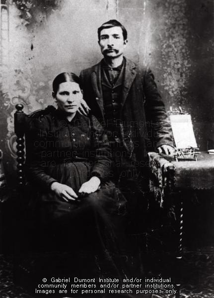 Description: This image is of Patrice Dumont and his wife Marie Louise Patenaude. They were living around or at Batoche in 1885. The couple were married on February 21, 1887, at Batoche. Patrice was the son of Isidore Dumont and Judith Parenteau. This photograph (an electronic copy) was given to Jessica by Danie Hardie while a copy of the original photo on a plaque was given to Jessica by her great-grandmother, Georgina (Dumont) Wall. Patrice and Marie Louise were Georgina's parents.