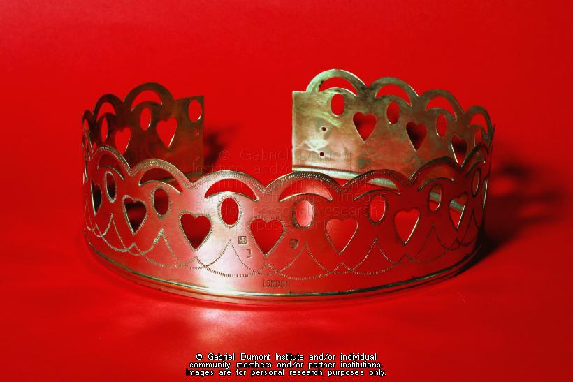 | Description: | This image is of a Hudson's Bay Company silver-plated crown. Such crowns were given to chiefs and other important people. This artifact is part of the Gabriel Dumont Institute collection. |