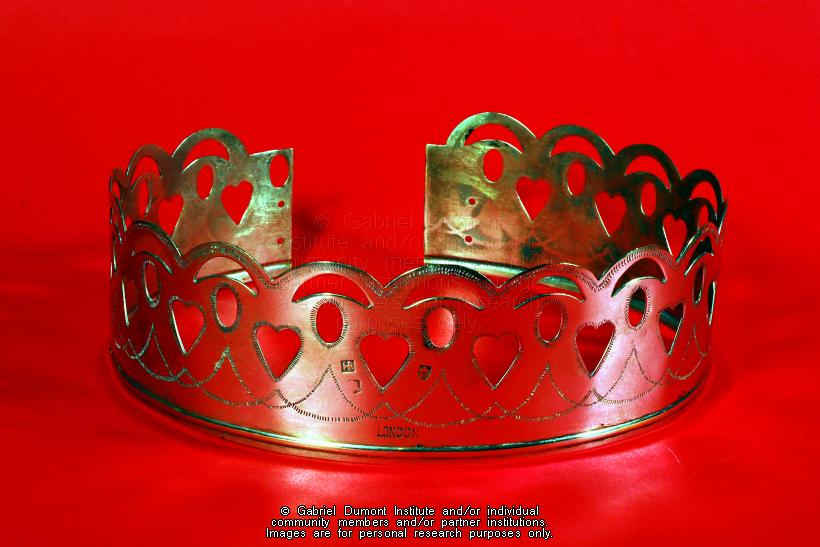 | Description: | This image is of a Hudson's Bay Company silver-plated crown. Such crowns were given to chiefs and other important people. This artifact is part of the Gabriel Dumont Institute collection. |