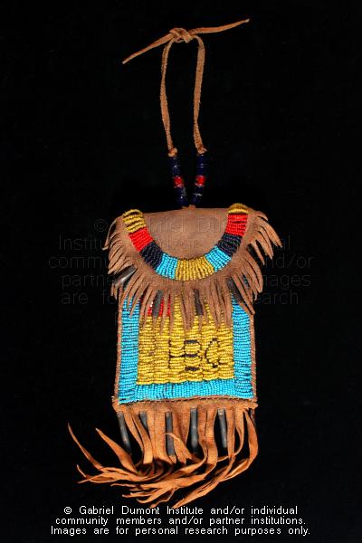 | Description: | This image is of a beaded strike-a-light pouch. It has HBC beads on it (greasy yellow, red, blue beads) and has a possible Swiss flag on it or an inverted English flag. This artifact is part of the Gabriel Dumont Institute collection. |