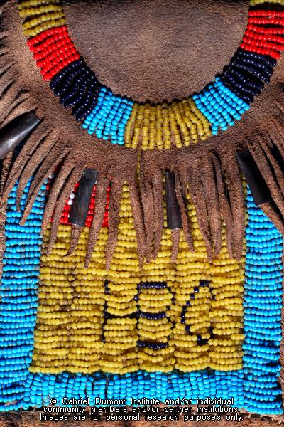 This image is replica of a beaded strike-a-light pouch. It has HBC beads on it (greasy yellow, red, blue beads) and has a possible Swiss flag on it or an inverted English flag. This artifact is part of the Gabriel Dumont Institute collection. |