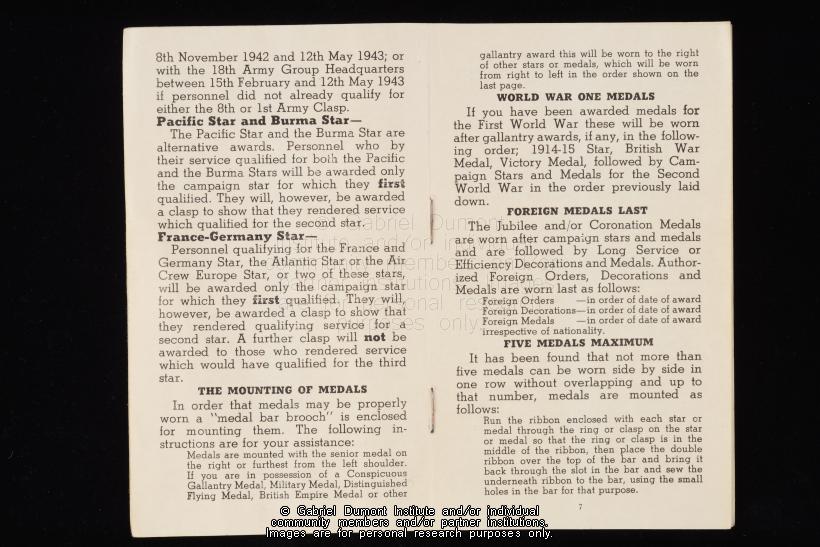This is an Image of the “Information Regarding Mounting and Wearing of Decorations, Campaign Stars and Medals Booklet” from the Second World War. Edward (“Ed’) Dumont was a veteran of the Second World War. This collection was donated to the Gabriel Dumont Institute by his niece, Elsie (Dumont) Busby and her husband, Berry Busby. |
