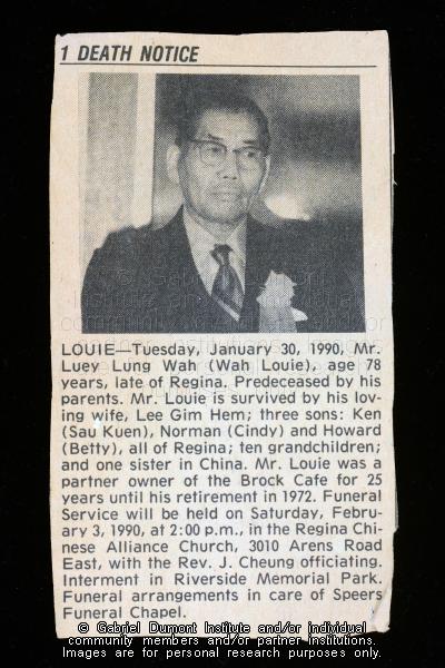 | Description: | This image is an obituary for Leuy Lung Wah. Edward (“Ed’) Dumont was a veteran of the Second World War. This collection was donated to the Gabriel Dumont Institute by his niece, Elsie (Dumont) Busby and her husband, Berry Busby.