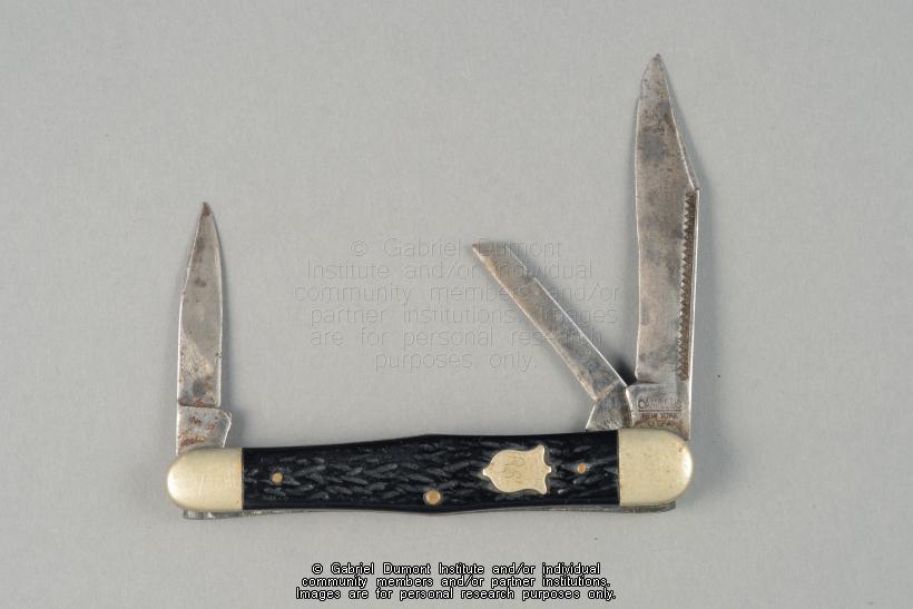 | Description: | This is an image of a pocket knife. Edward (“Ed’) Dumont was a veteran of the Second World War. This collection was donated to the Gabriel Dumont Institute by his niece, Elsie (Dumont) Busby and her husband, Berry Busby.