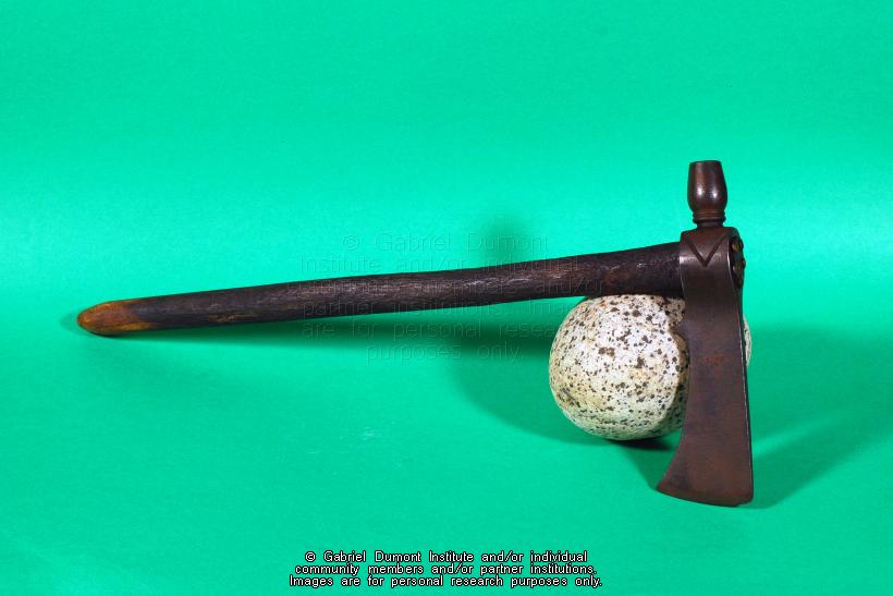This image is a replica of a ceremonial tomahawk and pipe. The pipe has a cartouche of a turtle on it. It was likely made from 200-year-old oak. Pipe part has tobacco residue in it. This artifact is part of the Gabriel Dumont Institute collection. |