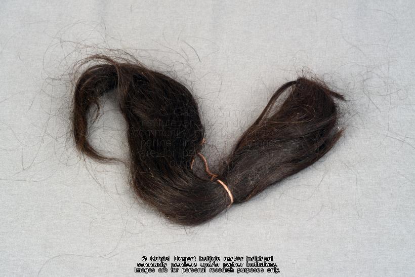 | Description: | This is an image of a lock of hair. Edward (“Ed’) Dumont was a veteran of the Second World War. This collection was donated to the Gabriel Dumont Institute by his niece, Elsie (Dumont) Busby and her husband, Berry Busby.