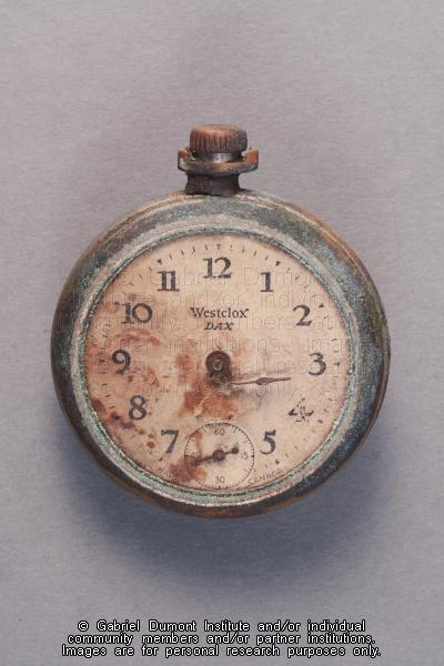Description: This is an image of a pocket watch. Edward (“Ed’) Dumont was a veteran of the Second World War. This collection was donated to the Gabriel Dumont Institute by his niece, Elsie (Dumont) Busby and her husband, Berry Busby.