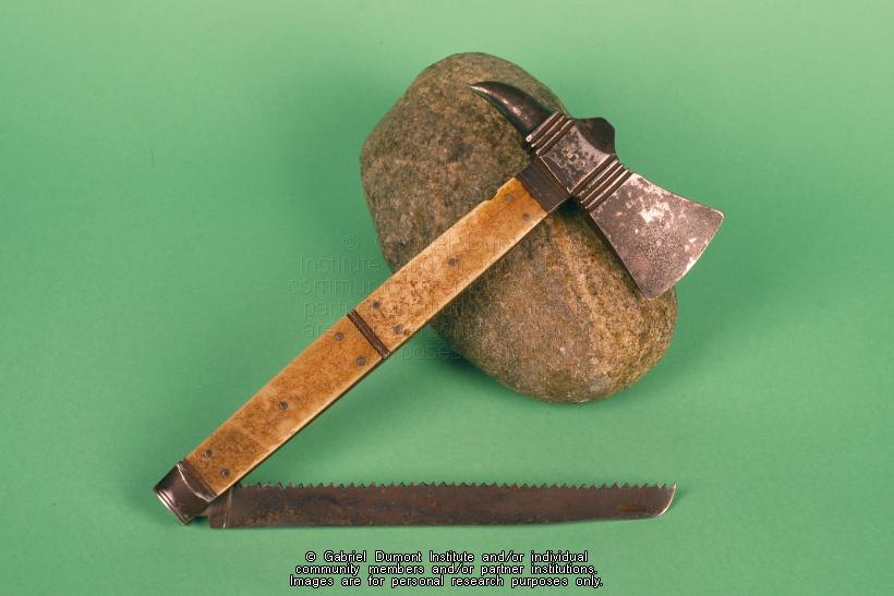 | Description: | This image is of a replica HBC serrated knife and axe made of bone and wrought iron. This artifact is part of the Gabriel Dumont Institute collection. |