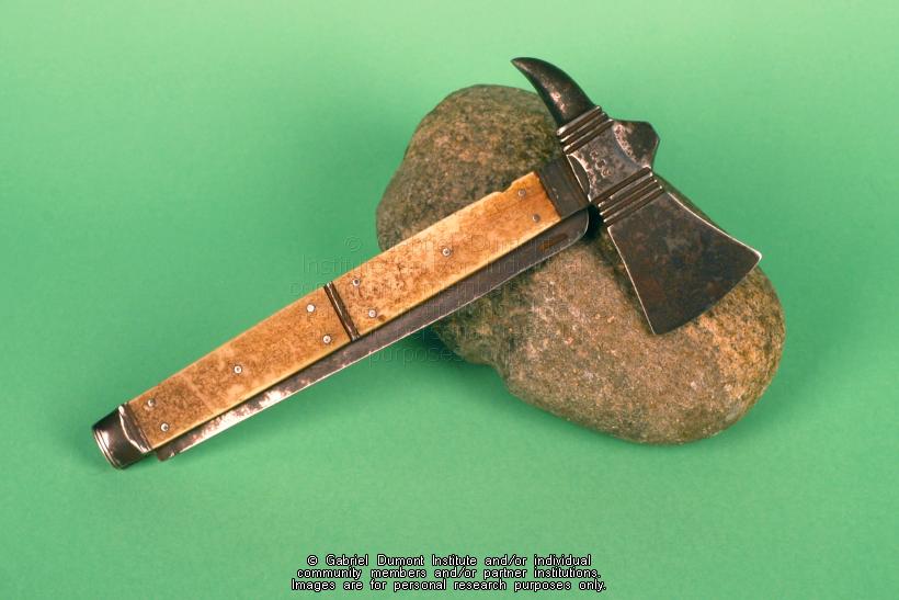 | Description: | This image is of a replica HBC serrated knife and axe made of bone and wrought iron. This artifact is part of the Gabriel Dumont Institute collection. |