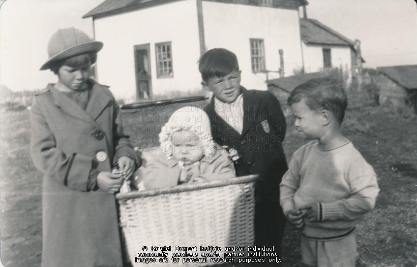 This is an image of (L-R) of Marie Anne (1929-1990), Estelle (1935-2012), Elzear (1931-2001), and Raphael Boyer (1934-2006). The photograph was taken from in front of Berthe’s and Edmond’s farmhouse. Josephte Paul Tourond appears in front of this farmhouse in another photograph in this section. Source: Brenda Boyer-Percell. This image must not be reproduced. The original source of this image is with Estelle Boyer. |