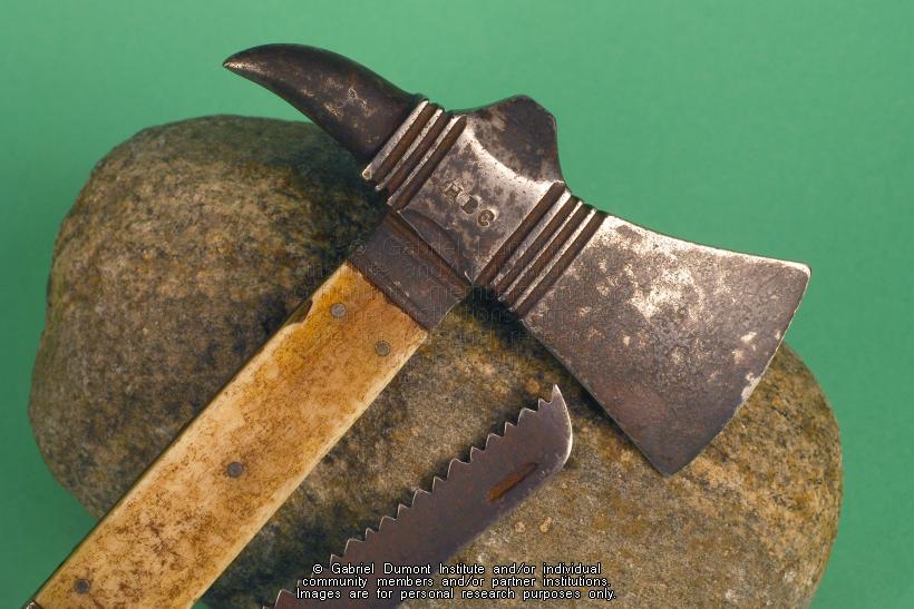 | Description: | This image is of a replica HBC serrated knife and axe made of bone and wrought iron. This artifact is part of the Gabriel Dumont Institute collection. |