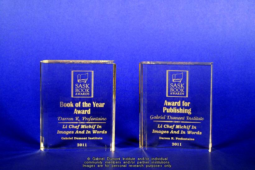 This image is of two 2011 Saskatchewan Book Awards won by the Gabriel Dumont for Darren Prefontaine`s book, ``Gabriel Dumont: Li Chef Michif in Images and in Words.`` The book won Book of the Year and the Gabriel Dumont Institute won Publisher of the Year for this book. To purchase ``Gabriel Dumont: Li Chef Michif in Images and in Words`` please visit:GDIʼs E-commerce Site. |