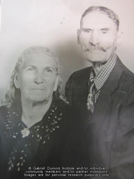 This is an image of Octavia Swan (1877–1972) and Isadore Landry (1875–1962). This image was donated to the Gabriel Dumont Institute by Seneca Landrie. The original source of this image rests with the Landrie family. This image must not be reproduced and can only be used for reference purposes only. |