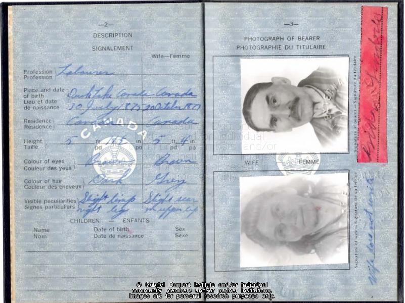 Description: This is an image of the passport of Isadore Landry (1875–1962) and Octavia Swan (1877–1972). This image was donated to the Gabriel Dumont Institute by Seneca Landrie. The original source of this image rests with the Landrie family. This image must not be reproduced and can only be used for reference purposes only.
