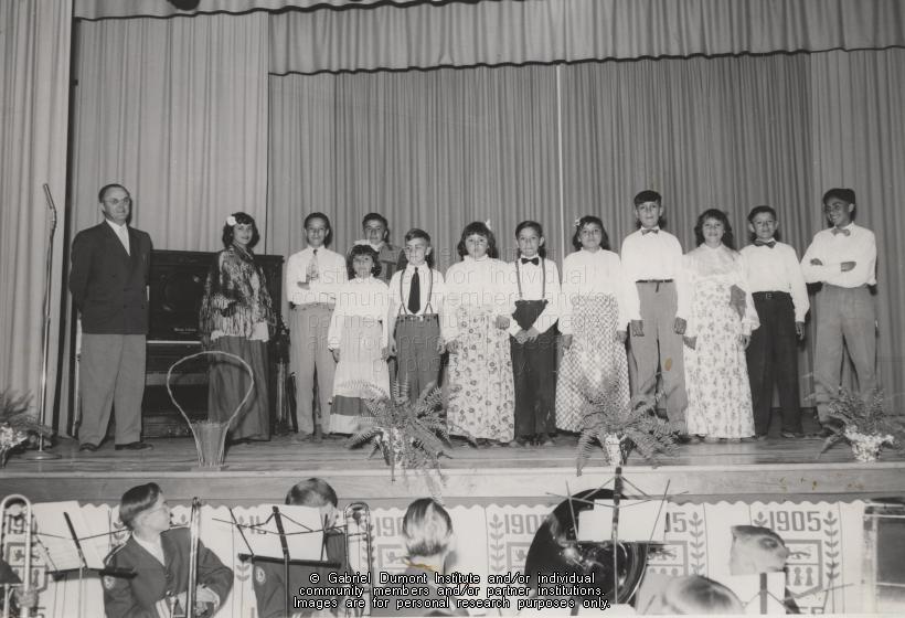 This is a photograph of Crescent Lake School Choir participating at the Yorkton Musical Festival in the 1950s. This photograph is part of the Nancy Leake Collection. This photograph is for research purposes only and cannot be preproduced. In 2017, Nancy Leake (née Hirsch) donated several archival files relating to her family’s experience of living in Crescent Lake, Saskatchewan—a Métis road allowance community. In 1946, her father, John S. Hirsch (1898-1995) was hired as the school’s first schoolteacher and community relief worker. Her mother, Elizabeth Mary Hirsch (1914-2013) also taught at Crescent Lake School. The Hirsch family lived and worked in Crescent Lake for ten years from 1946 to 1956. Nancy has many wonderful memories of living in Crescent Lake, which she wrote about in her memoires and is included in this collection. The Nancy Leake Collection consists of the following items: 1) Her memoirs of Crescent Lake School; 2) Elven Daily School Registers for the School prepared by her father, John S. Hirsch; and 3) 57 photographs. |