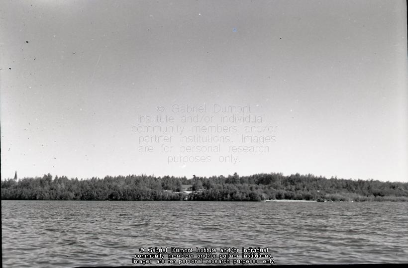 This is an image of La Ronge viewed from Lac La Ronge taken in September 1948 by Alfred L. Kirkby. The caption with the photograph reads, ”Settlement of Lac La Ronge taken from the lake including Andy Hastings and ? Sept. 1948.” |