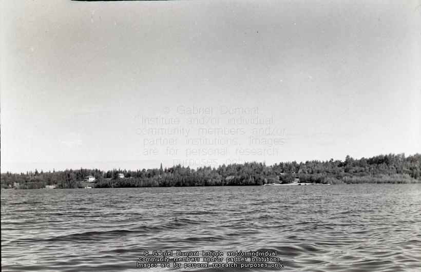 This is an image of La Ronge viewed from Lac La Ronge taken in September 1948 by Alfred L. Kirkby. The caption with the photograph reads, ”Settlement of Lac La Ronge taken from the lake including Andy Hastings and ? Sept. 1948.” |