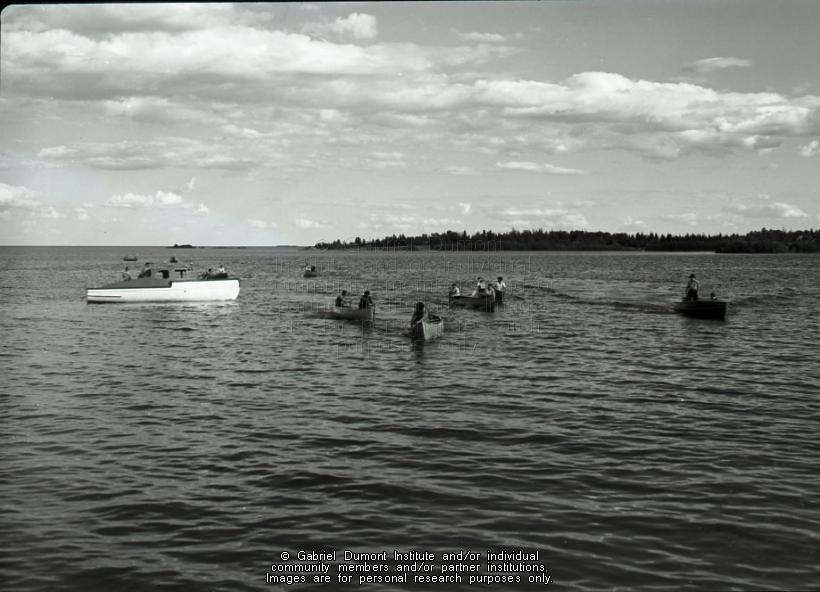 This photograph of the canoe race and other boats were likely taken on La Ronge Lake. The Gabriel Dumont Institute thanks Teron Roberts, John and Margaret Irving, and Anne Hrynuik for providing the correct descriptive information for this photograph. |