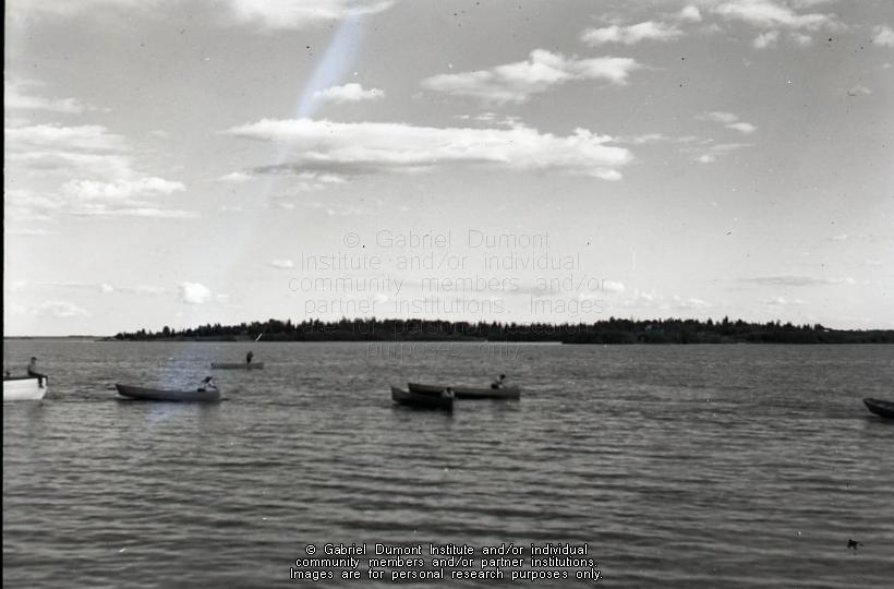 This photograph of the canoe race and other boats were likely taken on La Ronge Lake. The Gabriel Dumont Institute thanks Teron Roberts, John and Margaret Irving, and Anne Hrynuik for providing the correct descriptive information for this photograph. |