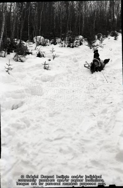 This is a photograph of one of the Kirkby children sledding down a hill. This is a series of photographs relating to the family of Alfred Lynden Kirkby (1910–1996), and include photographs of his wife, Jean Hall (Adam) Kirkby (1909–1956) and their children: Kathryn (Kay), Lynden, Marion, and Wendy. Other than the photograph of himself, these photographs were all taken by Alfred L. Kirkby. |