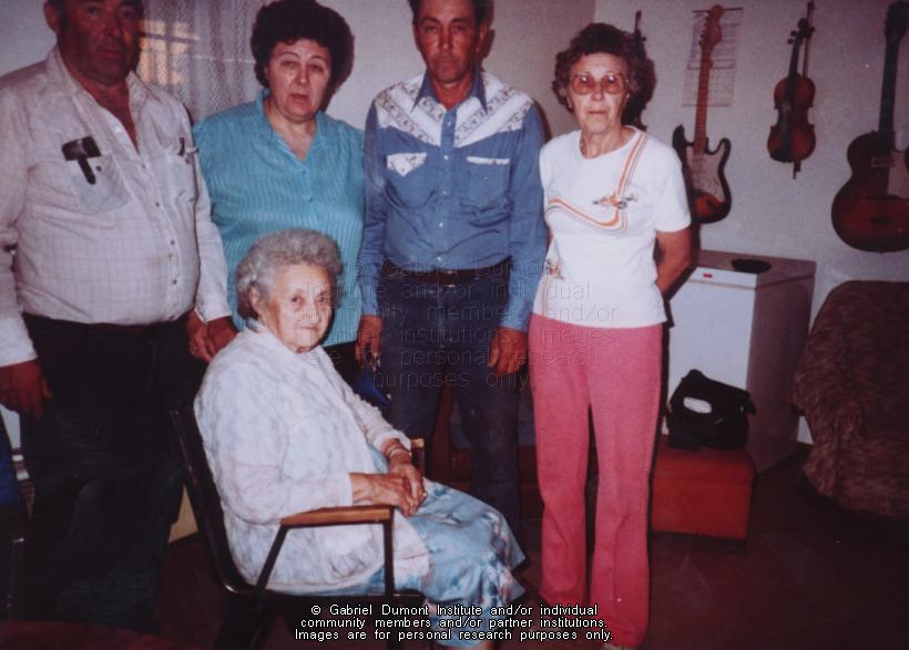 Photograph of (left to right) Leonard, Yvonne, Harold, Eva, and sitting in front, Rosalie Pambrun. Leonard is wearing a light plaid button-up shirt, Yvonne is wearing a turquoise blouse, Harold is wearing a blue button-up shirt with a white patterned yoke, Eva is wearing a white printed t-shirt and red polka dot pants, and Rosalie is wearing a blue printed dress with a white sweater. There is a fiddle and two guitars hanging up in the background. There is also a freezer and a chair in the background. |